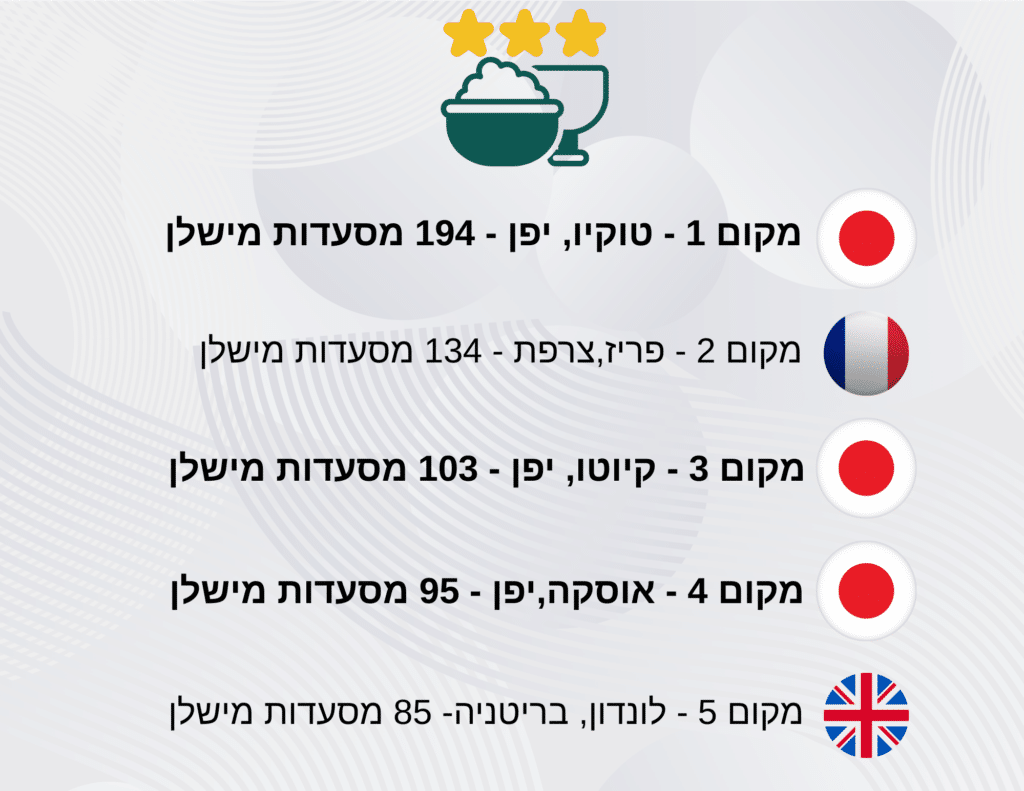 יפן ממשיכה לבסס את מעמדה כבירת הקולינריה העולמית, כאשר טוקיו, קיוטו ואוסקה מובילות את הדירוג העולמי עם מספר שיא של מסעדות בעלות כוכבי מישלן, שליטה כמעט מוחלטת בתחום.